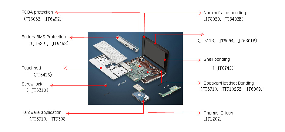 | PCBA Protection | Acrylate | JT6062, JT6452 | Good aging resistance, excellent sweat resistance in shaded areas JT6062 can be moisture cured |