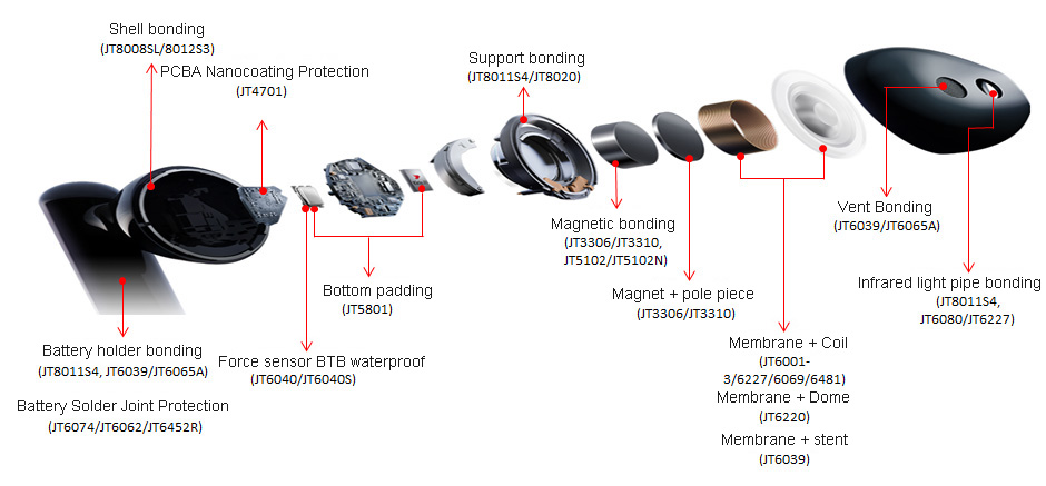 | Magnetic bonding | Anaerobic, epoxy | JT3306/JT3310, JT5102/JT5102N | Excellent drop resistance, high bond strength |
